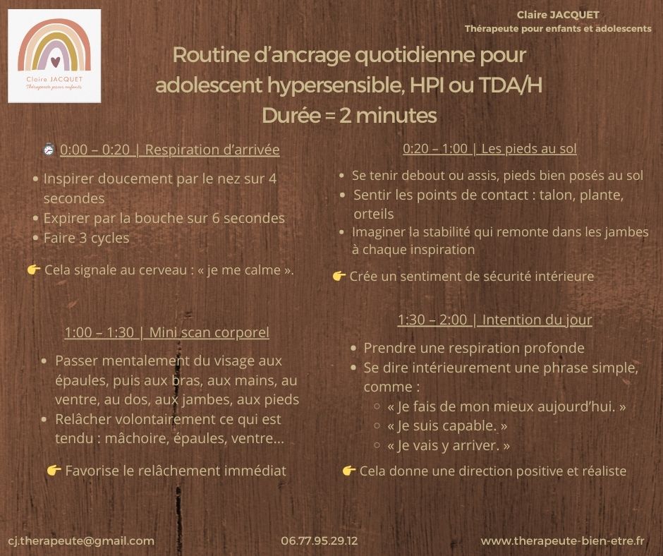 0 0 Non classé 27 novembre 2025 Voici une routine quotidienne d’ancrage énergétique de 2 minutes, simple, discrète et parfaitement adaptée à un adolescent Quelques conseils pour que ça fonctionne : La faire tous les matins, même rapidement. Peut être répétée avant un examen ou en période de stress. À faire aussi discrètement assis en classe si besoin. Bonne pratique ! %s Annuler la réponse Enregistrer mon nom, mon e-mail et mon site web dans le navigateur pour mon prochain commentaire. Envoyer mon commentaire